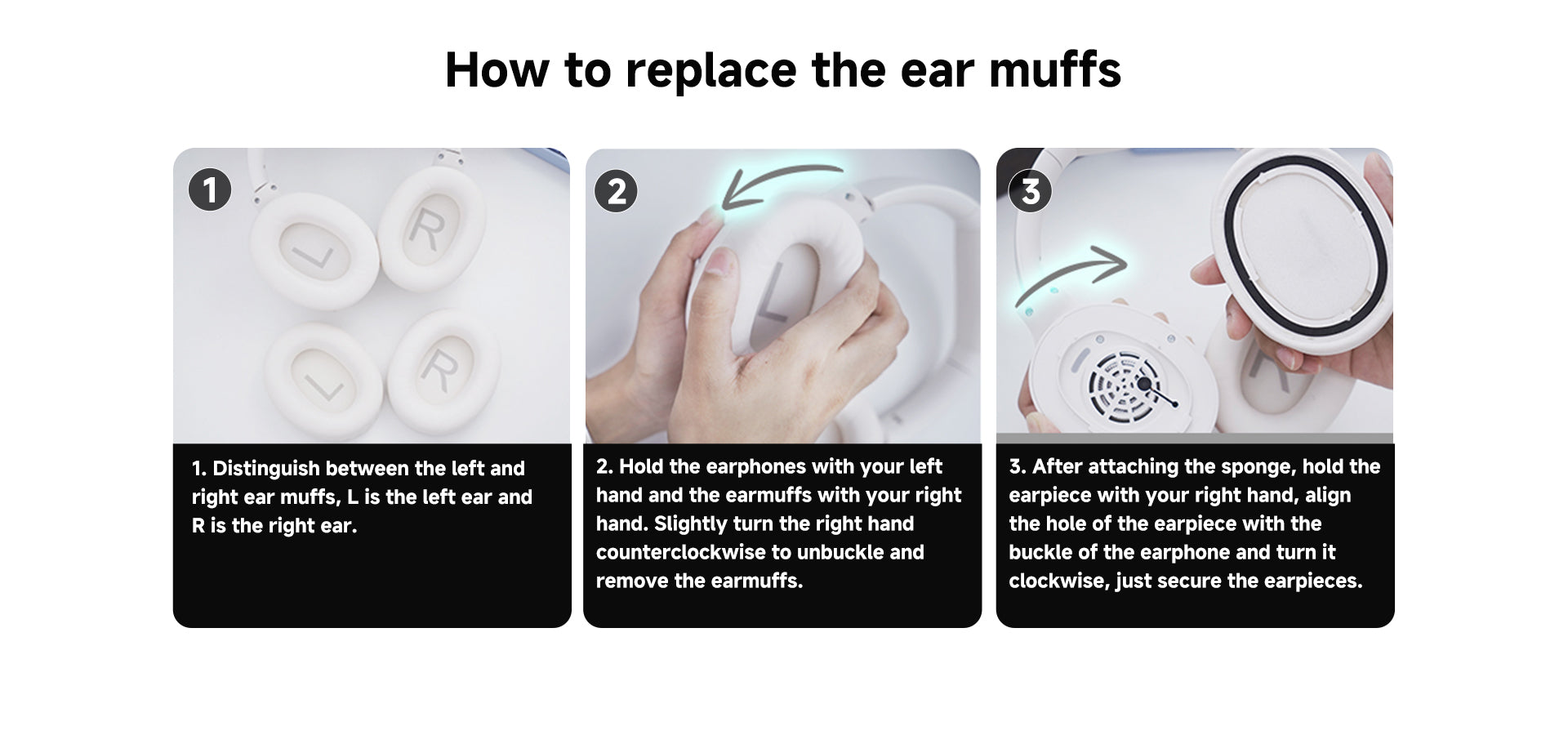 3. Depois de prender a esponja, segure o protetor auricular com a mão direita, alinhe o orifício do protetor auricular com a fivela do fone de ouvido e gire no sentido horário, apenas prenda os protetores auriculares.